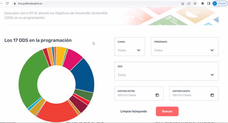 Another example of subtitle analysis comes from the Spanish public broadcaster RTVE, taken from a presentation on “SDGs key programming, taken from the 2023 EBU summit.10 According to the RTVE webpage11, the tool is defined as follows: Parliament 2030 is an innovative tool that tracks, gathers, and offers information on the activity of the RTVE programmes related to the Sustainable Development Goals (SDGs). Designed to overcome the challenges posed by the cross-cutting nature of the 2030 Agenda, SDG Programming classifies information related to the SDGs thanks to an advanced automatic mass labeling system. This innovative technology allows users to browse TV content related to the SDGs through a free and open online search engine. The information provided is essential for the monitoring and accountability of the implementation of the 2030 Agenda at the national level. It works by creating a database through an automatic mass labeling process that classifies it according to its relationship with any SDG or goal. It combines advanced computer science - necessary to scrape 520 subtitling hours in which information is published and transformed into a structured database - with the design of SDG dictionaries that automatically relate folksonomies to objectives and targets. Then, through an intuitive, attractive, and accessible search engine, it offers all the relevant information in reusable formats. Users can select their own search terms to tailor searches to their needs, as shown in figure 1.