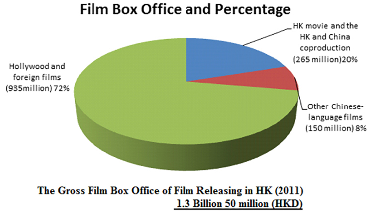 In 2011, Hong Kong (HK) cinema (including both HK movies and those coproduced with China) attained HK$265 million in total box office sales, of which HK$120 million (45%) was earned from “pure” HK films, and $145 million (55%) was earned from collaborative HK–China films. A quantity data analysis revealed that HK cinema produced 20 of 47 (43%) films released in 2011, and the remaining 27 (57%) were coproduced by HK and China. Furthermore, as 2011 closed, it was announced that You Are the Apple of My Eye (Ko, 2011) had grossed over HK$61,295,65,161 and became the all-time highest grossing Chinese film in the HK box office, a record previously held by Kung Fu Hustle (Chow, 2004), which had earned HK$61,278,697. 2 3 Additionally, the highest box office sales (HK$41,078,280) in 2011 were earned by 3D Sex and Zen: Extreme Ecstasy (Suen, 2011), a HK 3D erotic costume drama film; the lowest box office sales (HK$78,101) in 2011 were attained by Drugs 2 (HK–China film). Total box office sales earned from HK films (including both “pure” local HK movies and HK–China movies), was approximately HK$265 million (20%), and Hollywood and foreign films was approximately HK$935 million (72%) and other Chinese-language films was about HK$150 million (8%) of the gross box office sales (HK$ 1.35 billion) (see Figure 1).