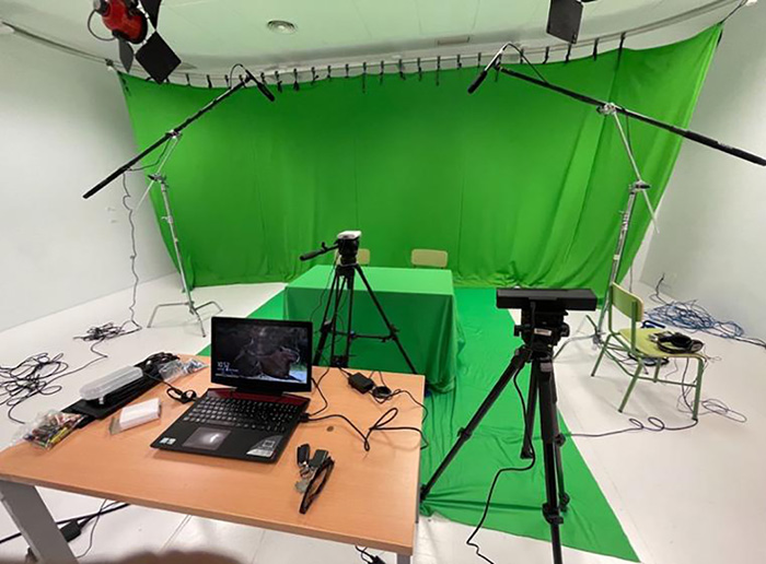 In the second session, we began to experiment with the technical aspects of 360 video recording (Figure 2). In this session, we recorded different exteriors with an Insta360 ONE X2 camera and then worked on the editing and exporting modes of the recorded clips using Insta360 Studio software. We then set up the set for volumetric capture using a green chroma background, two omnidirectional microphones on either side of the set with a Zoom H4 recorder, and a Microsoft Azure Kinect sensor connected to the Depthkit volumetric capture recording software. A basic lighting scheme was proposed with two fill lights and two background lights. After configuring the set and establishing the recording settings of the Depthkit volumetric video capture and editing software, we proceeded to record different volumetric video recordings and performances of the students in front of the Azure Kinect sensor, as could be seen in figure 2. After the recordings, the students learned how to edit and export the volumetric clips. Volumetrics were captured from a frontal position with only one sensor (180 degrees), trying different high levels of the sensor to test different ways of mimicking the POV of the audience.