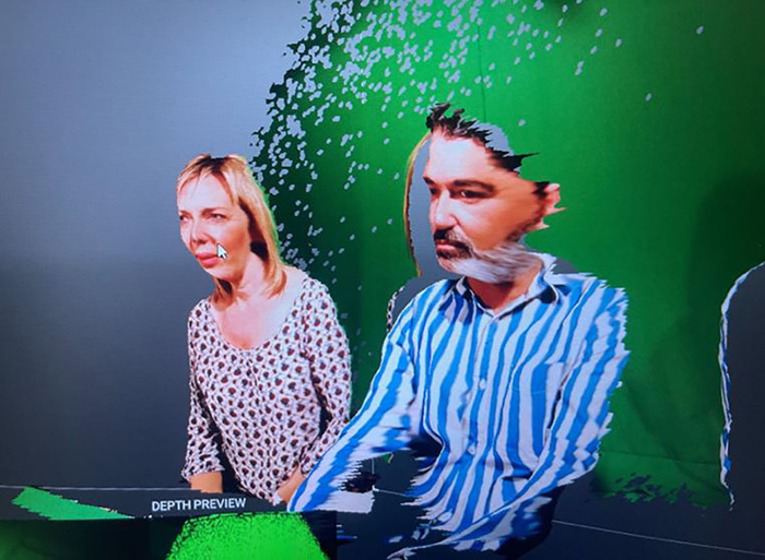 The scene was recorded with a professional actress and actor in the fifth and final session (Figure 3). The set had the same lighting and audio recording equipment as the second session, along with a Chroma background. After the session, the audio and volumetric clips were ready, and we started creating the 3D scene that will house the volumetric recordings for the upcoming virtual reality short film, which will hopefully last no more than two minutes. Finally, we worked on the editing of all the different registry layers (360 video, volumetrics, and 3D graphics).