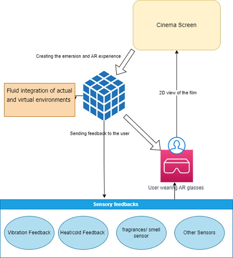 A key component of XR experiences is interaction, which determines how users will interact with the 3D representations. Depending on the intended level of immersion and the available technology, this might require a range of inputs. For instance, gestures can be utilised with portable controllers that capture hand and finger motions or in virtual reality settings where users wear gloves. The direction of the user’s gaze affects how they interact with the 3D models in both VR and AR experiences. This technology is known as gaze input. When a person or item approaches a particular 3D model, proximity sensors may recognize that proximity and initiate actions. Additional input methods may include physical buttons on portable controllers, voice instructions, or, in more sophisticated configurations, brain-computer interfaces. Ultimately, the choice of interactivity inputs will depend on the desired user experience and the technical feasibility of implementing these inputs in the XR application. Image 4 demonstrates how sensory feedback enhances the immersive experience and seamlessly integrates different scenes. Proximity sensors and location-based triggers allow interactions between the viewer and the actors in the film, activating various sensors based on the film’s actions. This innovative approach ensures that the sensory stimuli are precisely synchronized with the narrative, providing a highly engaging and realistic experience. The fluid integration of these elements allows viewers to feel as though they are an integral part of the story, bridging the gap between passive observation and active participation.