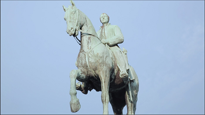 Quisiera empezar la reflexión sobre la multiplicidad de sentidos de estas imágenes, con la figura 3, un fotograma de mi documental que nos presenta la imagen de Albert dominando el plano. Lo primero que habría que decir es que, si uno no cuenta con una tecnología que le permita fotografiar desde lo alto al rey (una grúa o un dron), la única posibilidad de capturarlo es desde la vista del del peatón que se enfrenta con el monumento. En este caso, el zoom de la lente permitía encuadrar de modo que nos pareciera más cercana la imagen, aunque también la hace parecer más imponente, en un claro ángulo contrapicado, con sólo el cielo detrás de él.