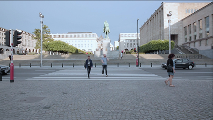 Cuando llegué por primera vez –y casi por accidente– al Monte de las Artes, la disposición espacial de las estatuas llamó mi atención casi de inmediato. Muy rápido supe que quería expresar esa misma sensación que yo había tenido al ver al rey Albert y a la reina Élisabeth en posiciones de poder tan asimétricas entre sí. Así que me coloqué desde el punto de vista de la reina, para retratar la inmensidad de la figura del rey. Después, intenté retratar el punto de vista del rey, y aquí sucedió algo sumamente interesante: sin importar la variedad de emplazamientos que intentara hacer con mi cámara y mi trípode, nada podía, en realidad, retratar lo que el rey ve. Si bien era posible ponerme frente a la reina, del otro lado de la calle (y de hecho, la figura 6 es el ejemplo), no es éste realmente el punto de vista de Albert, que en ningún momento la está volteando a ver. Esto quiere decir que la única posibilidad que me otorgó la cámara en ese momento (y por lo tanto el montaje) es hablar de la posición de ella respecto de él, y de la mirada de ella, más que la del rey. La mirada del rey, sólo la podemos imaginar pero nunca podremos estar en el lugar del rey. Este mismo sentimiento, que nacía de un razonamiento lógico como de sensaciones más bien intuitivas, es la que yo me propuse expresar a través del montaje.
