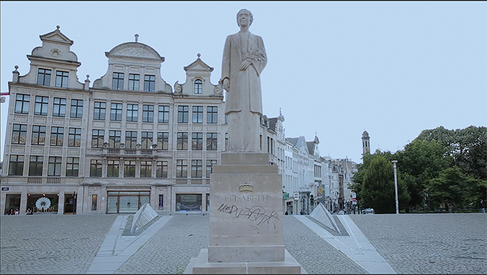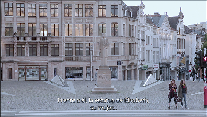 Tomemos, por ejemplo, los primeros dos planos de mi documental Por supuesto que tenemos papeles (pero no el que necesitamos) (2018). En primera instancia tenemos la imagen imponente del rey Albert, que reina sobre el paisaje urbano. Está colocado sobre varias escaleras, dominando el sitio en el que fue puesto. El siguiente plano (que es un contraplano) nos muestra a la reina Élisabeth, que mira hacia el lugar en el que su esposo, el rey Albert, monta su caballo.