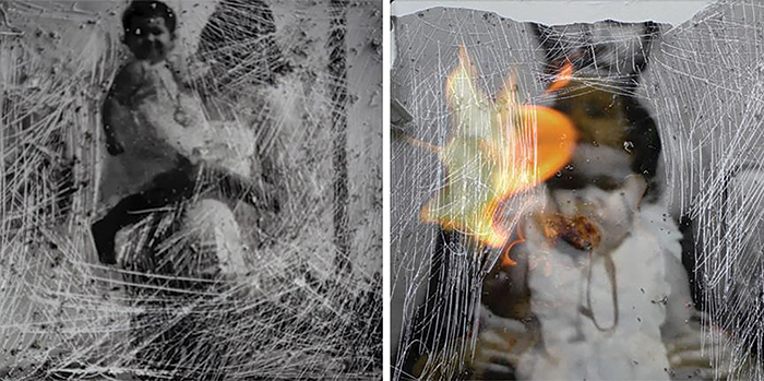 No caso específico de Self e A Menina do Rio, o que predomina é um caráter tátil, que reforça tanto a manualidade do processo, quanto suas subjetividades intrínsecas. A subjetividade se insere, de igual modo, através da técnica e da performance do corpo que interfere nas imagens. Particularmente em Self, (ver figura 2) constam fotografias que evocam um ambiente doméstico, marcado pelo registro de convívio entre mãe e filho(a). No vídeo A Menina do Rio, o retrato utilizado origina-se de um antigo documento de identificação da avó materna do primeiro autor. Os retratos nos vídeos, tornam-se, portanto, peça-chave de um diálogo visual-afetivo, porque se apresentam carregados de subjetividades conferidas pelo gesto dos cortes, costuras e apagamento das imagens ali impressas e, porque provêm de arquivo pessoal, acumulam histórias que são agregadas ao enredo inscrito na ação de cada gesto, impregnados de uma experiência afetiva.