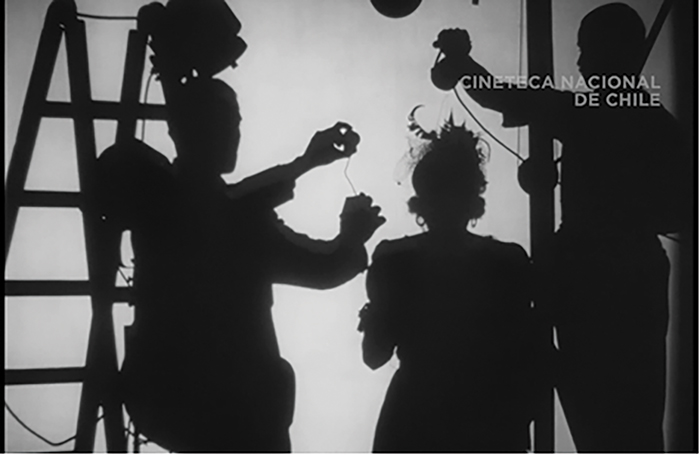 Los inicios de sus filmes son aperturas que exponen el mecanismo cinematográfico, desde la lógica de un metacine. En P’al otro lao, los mismos personajes se presentan mirando a cámara, rompiendo de esta forma la cuarta pared y mostrando parte del backstage de la película (Fig. 2). En Sonrisas de Chile, la presentación del filme desde una sala de montaje o backstage, donde Bohr interpreta a sí mismo, inaugura la película con un gesto metacinematográfico que instala el artificio como parte de la experiencia. Este juego con la autorreferencia está presente también en P’al otro lao, donde se menciona al camarógrafo en medio de la escena, y en El gran circo Chamorro, donde se integra la lógica del espectáculo itinerante al propio dispositivo cinematográfico.