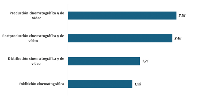 En la otra parte, la distribución también presenta una ata capacidad de impacto, presentando una alta capacidad de generación de rentas que se resume en una producción adicional en la economía del 70% de la inversión y demanda realizadas en este sector. Finalmente, las salas de cine son el colofón a la contribución del sector del cine a la economía española, con una capacidad de generación de renta y empleo, que está cerca de ser 1,5 veces la media de todas las actividades económicas. Este se ilustra con el impacto estimado de la compra de una entrada para una película en el conjunto de la economía, que más de un 50% adicional a su propio valor.