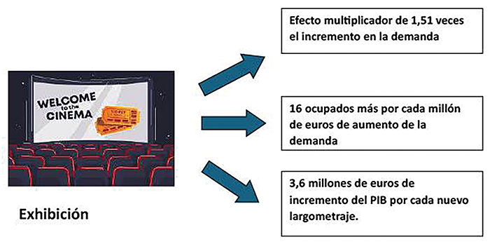 Las salas de exhibición de películas tienen suponen otra parte fundamental de la contribución del sector del cine a la economía. Presentan una capacidad de generación de renta y empleo, con un efecto multiplicador de la producción de 1,53 y una generación de 610 mil euros al PIB por cada millón de demanda adicional, con la creación de 16 empleos (una capacidad que está cerca de 1,5 veces la media de todas las actividades económicas).