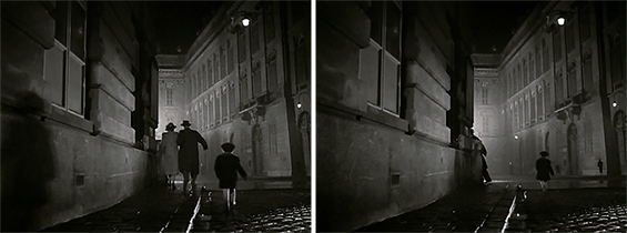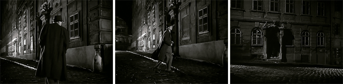 Después de que Holly Martins descubre a Harry Lime en el portal, intenta aproximarse, pero, repentinamente, un coche aparece y se lo impide [véanse fotogramas 58 a 71]. Una vez que hubo pasado el coche, Martins se aproxima al portal donde vio a su amigo, pero éste ha desaparecido.