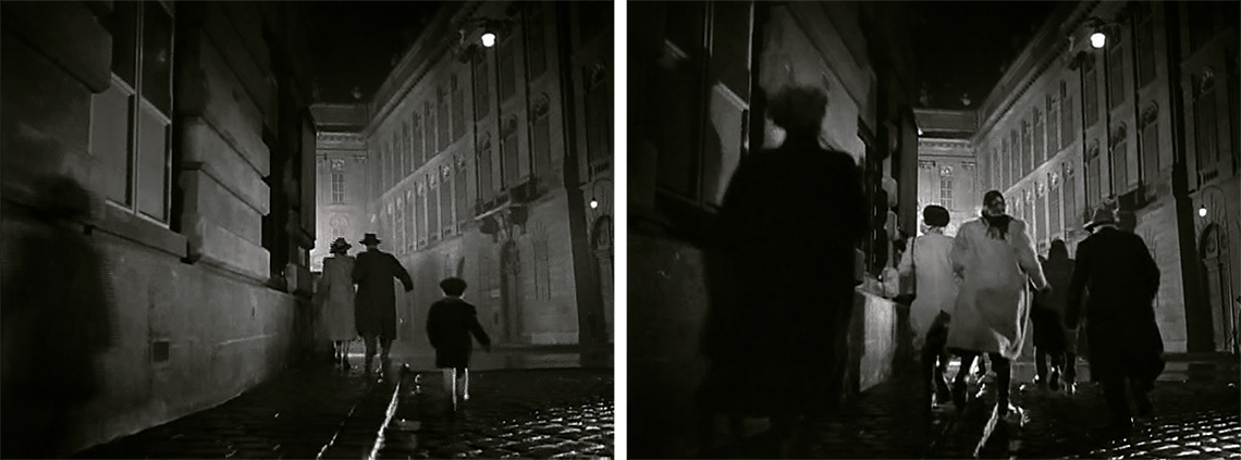 Escena 16 - plano / contraplano que capta la huida de Anna y Holly de la Josefsplatz. La secuencia sugiere que éstos huyen hacia la Augusterstrasse, es decir, hacia el sur [fotogramas 35 y 36]