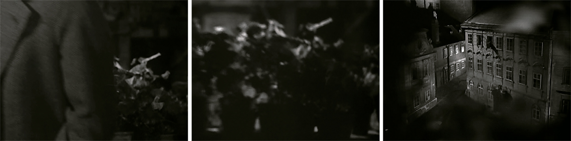 Escena 25 – La cámara se traslada al espacio frente al departamento de Anna Schmidt mientras sigue el recorrido del gato de Harry Lime que sale por la ventana a presentir la presencia de su querido amo [fotogramas 52 a 57]