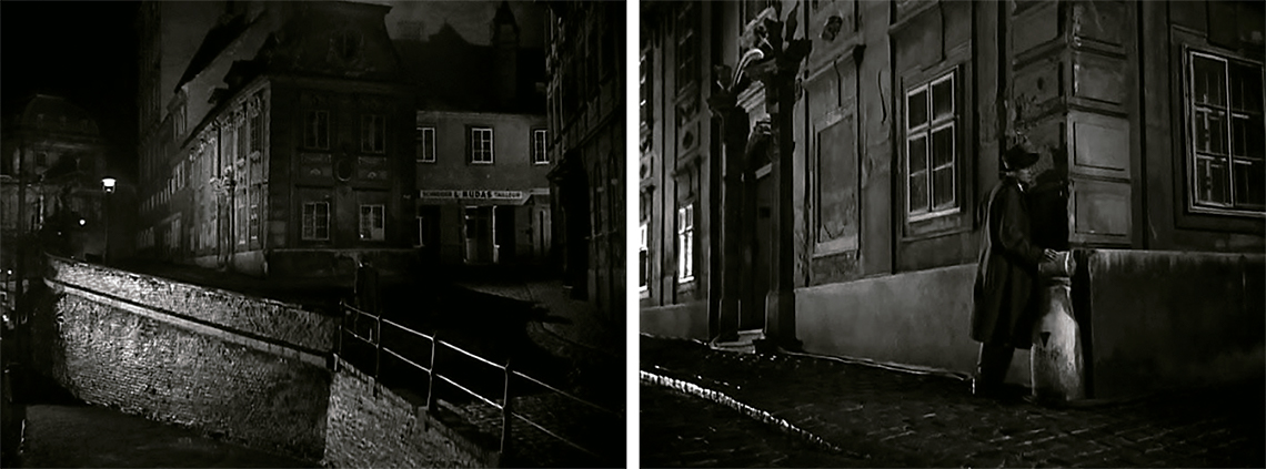 Efectivamente, la Viena que nos revela El Tercer Hombre es una ciudad sombría, tan oscura por la vida que palpita en sus entrañas como por su fotografía en blanco y negro que se regodea en los cuadros inclinados, en los fuertes contrastes o en los grises desoladores y tristes de lugares atribulados y vacíos. Abundan las tomas nocturnas en las que el espacio está apenas iluminado por focos ocultos tras las esquinas de los edificios o de muros semiderruidos que producen contraluces de potentes contrastes. Focos luminosos rasantes y bajos que crean sombras fantasmales de seres que se mueven en un espacio desolado, onírico, casi irreal.