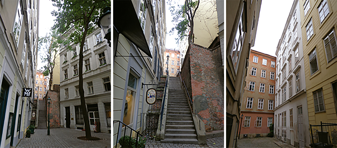 Fotos 15, 16,17,18,19,20, 21 - Fotos de la Schreyvogelgasse tomadas en 2015. La secuencia fotográfica pretende realizar el recorrido de huida de Harry Lime y de la persecución por parte de Holly Martins. Muestra en detalle el portal donde supuestamente aparece Lime durante el filme (Escena 26), [Fotos 15 a 21, tomadas por el autor en agosto de 2015]