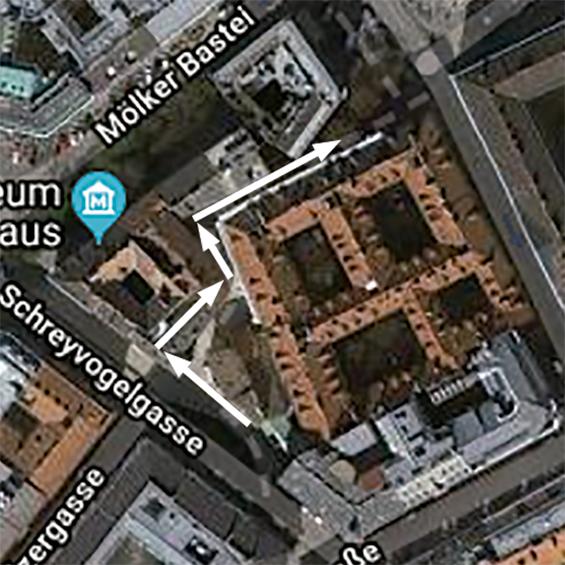 1 Así por ejemplo, si analizamos este recorrido, veremos que es imposible pasar directamente y en pocos segundos desde la Schreyvogelgasse a Am Hof, solo atravesando el arco del pasaje Schulhof, al costado de la Kirche am Hof.