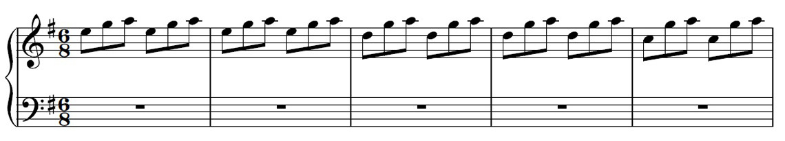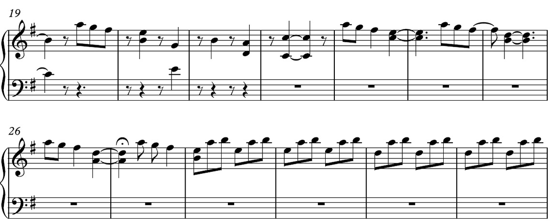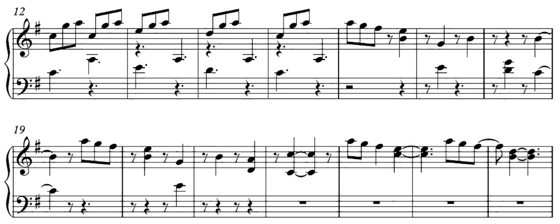 A música ganha acompanhamento da clave de fá a partir do compasso sete, ressaltando e contrapondo com as mesmas notas da clave de sol apenas uma oitava abaixo do tema que vem sendo tocado. Posteriormente, entre os compassos treze e quinze, por meio da liquidação do motivo musical7 destaca-se no segundo tempo de cada compasso o isolamento de uma única nota que antecede o espectador para a próxima fase da música.