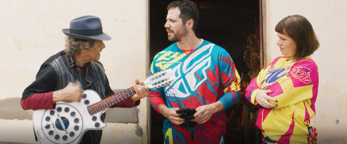 A música diegética também é um elemento que costuma aparecer bastante no trabalho da dupla – Juliano já fazia parte da equipe nos filmes anteriores de Kleber. No caso de Bacurau, a fonte da música está presente em muitas cenas, principalmente na participação de Rodger Rogério, que além de ator é um tradicional cantor e compositor cearense, com grande destaque local desde os anos 1970, e no filme interpreta um violeiro. Mais uma vez percebemos o cuidado com o resgate e valorização da memória do povo nordestino. Na primeira vez que ouvimos sua viola, ela começa fora de quadro, se revelando em seguida, quando o personagem de Rodger aparece e notamos se tratar do velório de Dona Carmelita, representada pela célebre cirandeira Lia de Itamaracá. Rodger também compôs uma das canções do filme, As boas vindas de carranca, que é tocada de forma provocativa para os motoqueiros forasteiros, caracterizando a figura do violeiro como uma espécie de narrador dos fatos da trama.