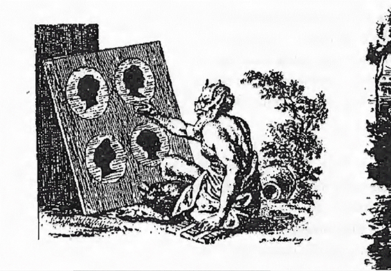 Na gravura (figura 5) de Johan Caspar Lavater, retirada do livro de sua autoria Fragmentos Fisionômicos (Physiognomische Fragmente), de 1776, observamos no segundo capítulo um diabo, que aparece na forma de um sátiro que coleciona silhuetas (STOICHITA, 2009).