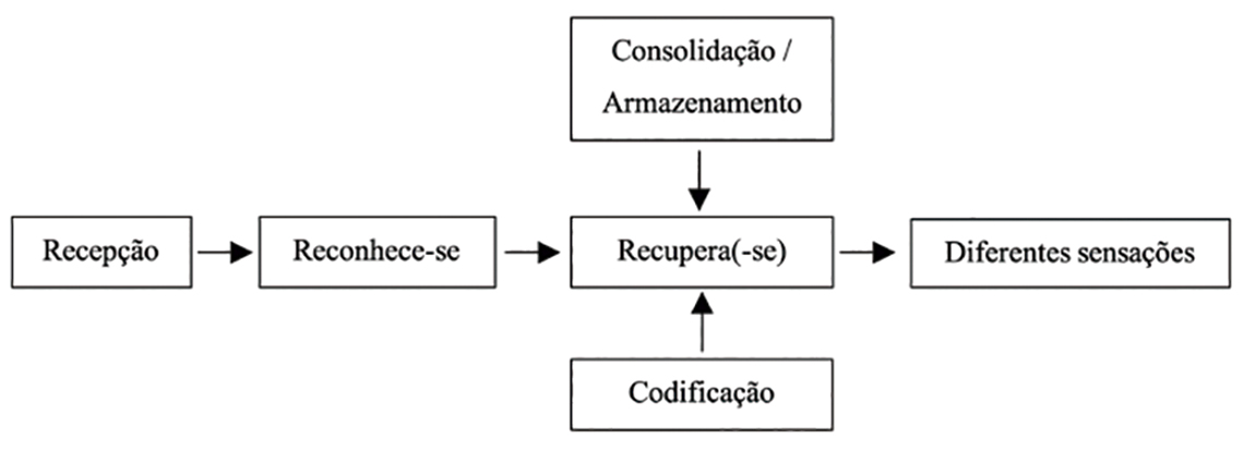 Nunes (2008, 133) começa por dividir a memória voluntária de involuntária: define a memória voluntária como aquela que vem ao pensamento por nossa própria vontade, por procura intencional; e a involuntária, quando vem à mente espontaneamente, de modo automático, sem aparente intenção, sem esforço e sem o nosso controlo. A capacidade de recordação de experiências é dividida essencialmente em três níveis: sensorial, curto prazo e longo prazo, com Ferrão e Rodrigues (2000, 69) a relembrarem a volatilidade da memória sensorial (ou icónica). No mesmo sentido, Evans, Jamal e Foxall (2012, 91) descrevem a memória sensorial como um ‘armazenamento’ temporário e uma vez que foi formada sem atenção ou interpretação, pode ser rapidamente perdida. A memória de curto prazo reflete um processo consciente e ativo de memorização da informação recebida. Ferrão e Rodrigues (2000) comparam a memória de curto termo (ou primária) com a memória RAM dos computadores. Na mesma analogia, referem a memória ROM para descrever a memória de longo termo (ou secundária), aquela que retém as informações percecionadas e que são selecionadas e codificadas de uma forma permanente. A relação da memória com a aprendizagem e a sua interdependência é igualmente abordada por estes autores que relevam a importância de informação prévia ou conceitos-âncora na retenção de novas informações. Segundo Tomé (2003, 17), esta viagem de dados entre a memória de curto prazo e longo prazo é determinada por fatores como “a experiência do mundo e da vida”, que fortalecem “a passagem da informação ao estádio superior do conhecimento”. A memória é também referida por Lafontaine (2007, 51) como o símbolo da interioridade subjetiva e como papel central na psicanálise e do caráter irreversível associado ao conceito do inconsciente de Freud. Este processamento de informação, que ocorre em tempo real, de uma forma subliminar ou não, ocorre na rede neuronal, no que para Ernst (2019, 170) representa “uma espécie de microarquivo dinâmico de instantes”. Para este autor, tanto esta perceção neurológica como a cultura digital tem base na memória, mesmo que no “efémero armazenamento de curto prazo”.