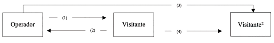 Baseado no modelo de interface de Bricken (apud Giannetti, 2012, 108), desenvolvemos um modelo de comunicação entre os intervenientes do artefacto Clash (and dance) Yourself e a forma como as comunicações se estabelecem. O fluxo de inputs e outputs de conteúdos da experiência é gerido por um operador em modo veejay, em tempo real e não linear. Na figura 5 podemos ver o esquema de funcionamento do circuito. O operador sugere conteúdos ao utilizador (1). Este, participando com a sua dança, proporciona conteúdos para o operador (2), que os armazena e fornece de novo ao visitante (3). O visitante conclui a experiência vendo-se transformado no conteúdo e visitante, numa existência potenciada de si próprio (4).