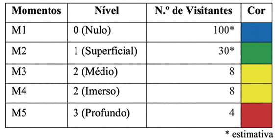 A partir da tabela de Nunes (2008, 7) estabeleceram-se diferentes etapas do comportamento observável do visitante e os parâmetros que complementem a perceção da imersão induzida. Conforme Canossa (2020, 41, tradução nossa), espera–se que os níveis de imersão obtidos desencadeiem mediadores químicos associados às sensações que se pretende provocar.