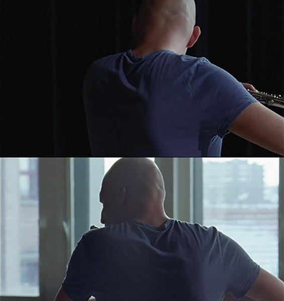 Es decir, para captar cómo la pieza musical Studium I. – L(élek)zem en su persistencia ininterrumpida de un tono melódico se despliega por el espacio, la artista rodea el cuerpo del músico agenciándose de su respiración y sonido, materializando su afección en el aire de la estancia. La ruptura del clásico espacio escénico acompaña la relativización del cuerpo interpretativo. En lugar de fijar la figura en una frontalidad estática dentro del plano, el rodeo circular logra que el espectador perciba el cuerpo del artista como instrumento melódico, pues, en esta pieza, no asistimos a un músico que hace sonar una flauta, que se expresa a través de su instrumento, sino que, puesto que tanto la exhalación como la inhalación suenan, ambos son cuerpos sonoros unidos. Esta comunión se percibe gracias al rodeo de la cámara alrededor del cuerpo que respira y se ve afectado –en nariz, boca, cuello, pecho y brazos- por el acto interpretativo.