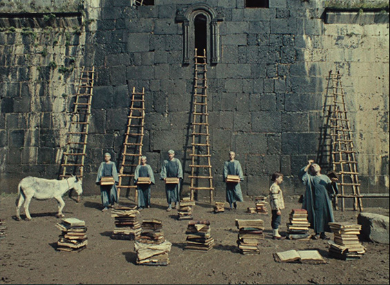 Rather than zoom in or change focal lengths, the camera in the film is static, and people and animals move closer or further away in a two-dimensional manner. In Figure 3.1, monks are slowly approaching the pile of books in an unrealistic fashion, while Harutyun (young Sayat-Nova) stands in profile and is motionless in the right corner of the frame. And with frontal gaze to the camera, the attention is on the monks who try to dry the rainwater-soaked books by piling them up in front of the church. With the use of frontality Parajanov guides our concentration to the books and maintains stillness: the figures are moving, but because they gaze directly at the camera and their movements are slow, the audience’s attention gets distracted from the motion as they reflectively look back into the eyes of the monks. Thus, Parajanov creates an illusion of stillness through slow movement and frontality.