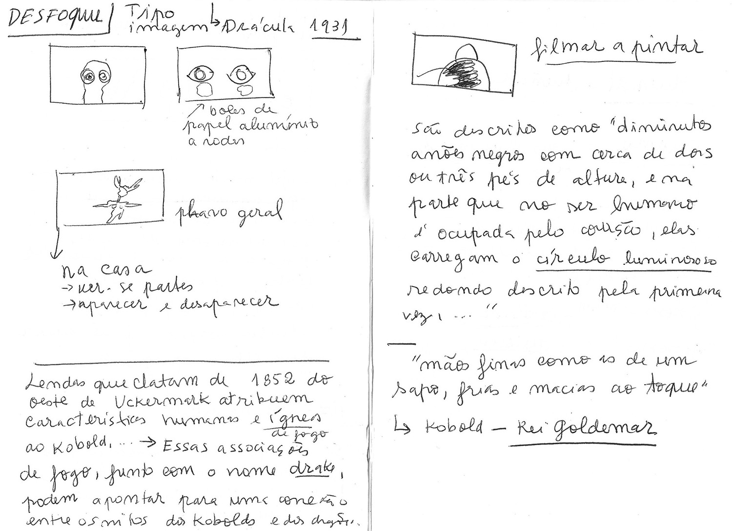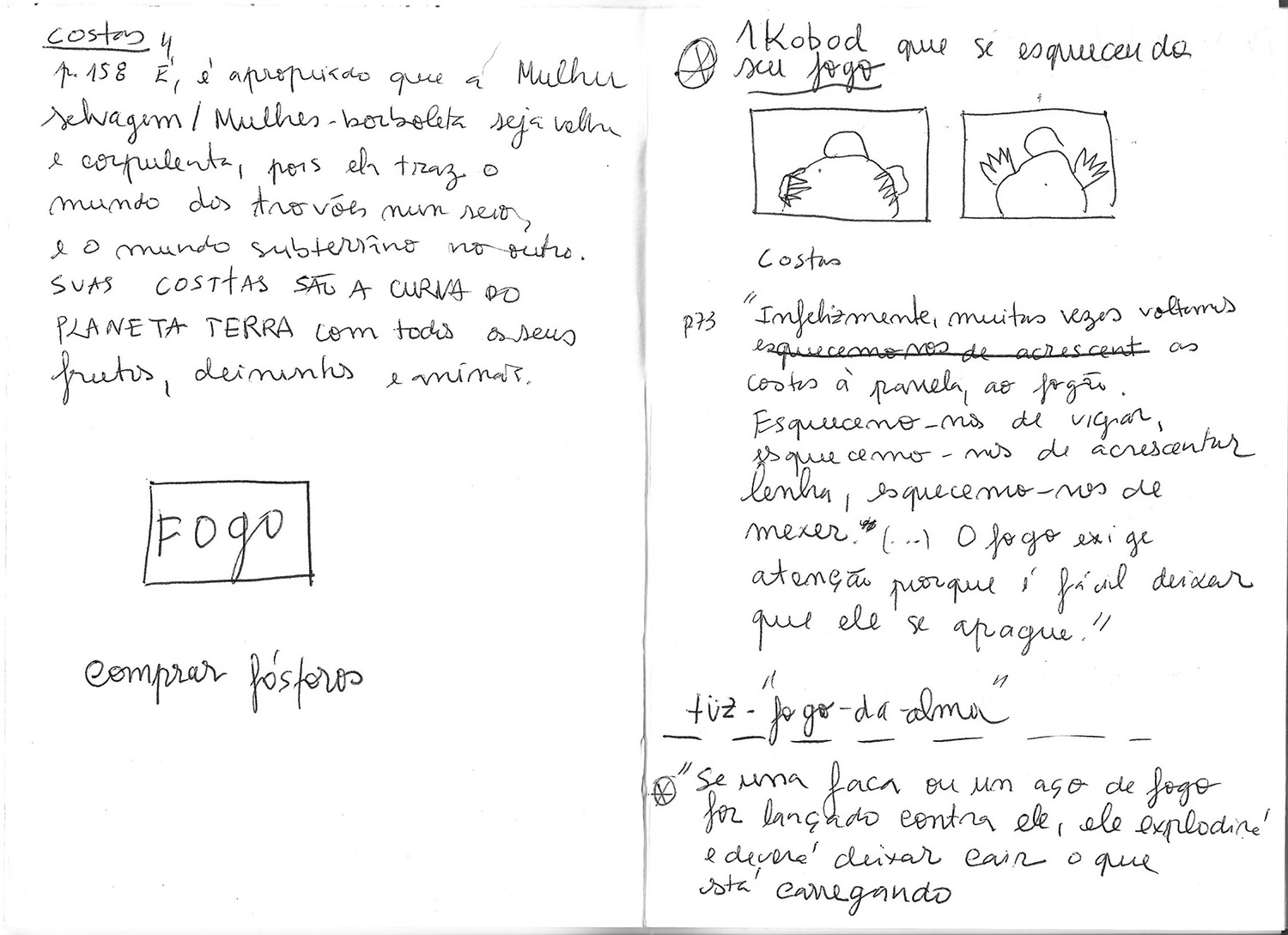Figura 7 – Desenhos rápidos de estudos da ação e dos planos (storyboard), para a realização das gravações do vídeo, acompanhados de recolha de textos do livro “Mulheres que Correm com os Lobos: Mitos e Histórias do Arquétipo da Mulher Selvagem”, de Clarissa Pinkola Estés, 2016.