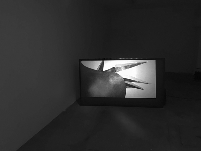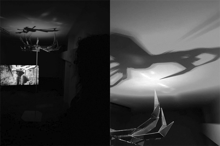 Figuras 13 e 14 - Instalação do vídeo “The Gnome”, Sónia Carvalho, 2021 e da peça “Nahui Ollin”, 2017-2021, Sónia Carvalho, no âmbito da exposição TRANSATLÂNTICO, 2021, no espaço FISGA, Porto.