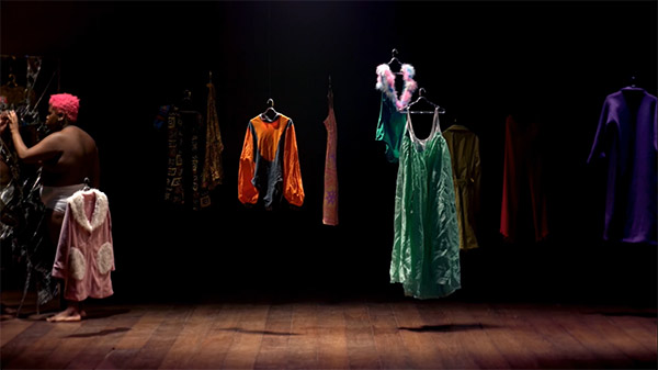 Ele continua despido, como uma figura sem identidade, até que num novo corte, aparecem várias roupas no cenário. Erick ainda em um processo de se reconhecer, começa a utilizar esses diferentes acessórios e roupas que aparecem em cena (figura 2).