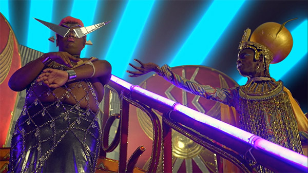 Imediatamente após o trecho “Hoje vamos olhar para o futuro de onde tudo começou!”, há um corte rápido — em sincronia com a batida eletrônica do funk —, e aparece Erick (protagonista do primeiro ato do filme), que se junta à performance de Aretha. Há um visível contraste entre a caracterização das duas personagens: enquanto o figurino e os adereços de Aretha remetem ao passado africano, as formas geométricas do figurino de Erick aludem ao futuro negro. Materializa-se, por meio das imagens (figura 3), a confluência temporal anteriormente sugerida na fala de Aretha: passado e futuro se encontram na construção do presente.