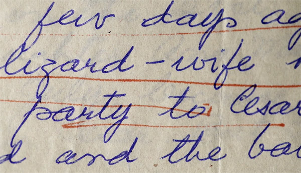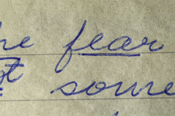 Na sequência em que a câmera percorre capas de livros - ancorada na voz em off de Iramaya narrando como burlava a censura dos militares – a imagem incompleta, por vezes desfocada dos títulos e autores é interrompida por um breve silêncio trazendo a materialidade da carta à cena - tempo aproximado 22:18 (figura 3). Quando a caligrafia caprichada, sublinhada, rasurada, toma todo o enquadramento, revelando texturas e espessuras de um outro tempo, alcançamos não somente a permanente violência e angústia que cingia o momento, mas também algo outro que não participa da visualidade, mas lá está, eclipsado, oculto, em retraimento (retrait), ou seja: aquilo que não pode ser visto mas ainda assim é sugerido pelo traço (DERRIDA, 2010).