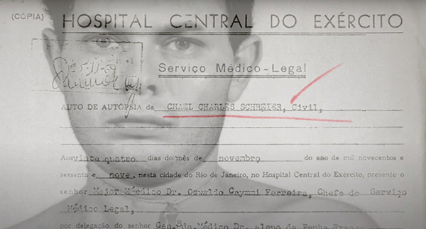 Escrever sob rasura insere uma marca na palavra estabelecendo um movimento duplo entre legibilidade e apagamento, ou seja, o traço que rasura traz uma instabilidade capaz de interferir na apreensão daquilo que é dado. Como na sequência em que o laudo e o atestado do óbito de Chael Schreier sobrepõem-se a sua fotografia - tempo aproximado 26:41 (figura 12) - lido pausadamente pela voz em off de Antônio Roberto Espinosa. Entre as imagens, o que resta é o nome sublinhado, misturando-se ao rosto, seguido pela inscrição numérica do prisioneiro. Dessa forma, as grafias que ali nomeiam, somadas às sobreposições, podem ser vistas como uma rasura que interfere na apreensão desse sujeito.