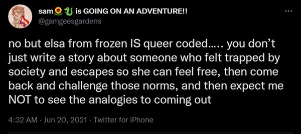 Figure 2. Twitter user @gamgeesgardens’s post on Elsa being queer coded.