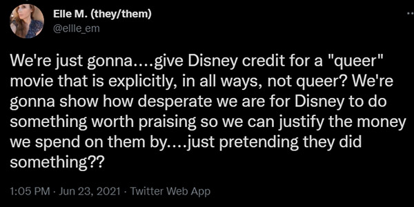 Maruska, Elle. 2021. We’re just gonna....give Disney credit for a “queer” movie that is explicitly, in all ways, not queer?. [Twitter] Available at: <https://twitter.com/ellle_em/status/1407671162990206976> [Accessed 14 September 2021].