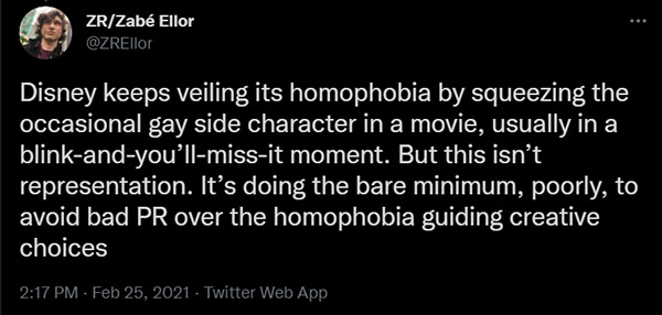 Ellor, Zabé. 2021. Disney keeps veiling its homophobia by squeezing the occasional gay side character in a movie.... [Twitter] Available at: <https://twitter.com/ZREllor/status/1364942495495434242> [Accessed 14 September 2021].