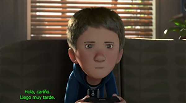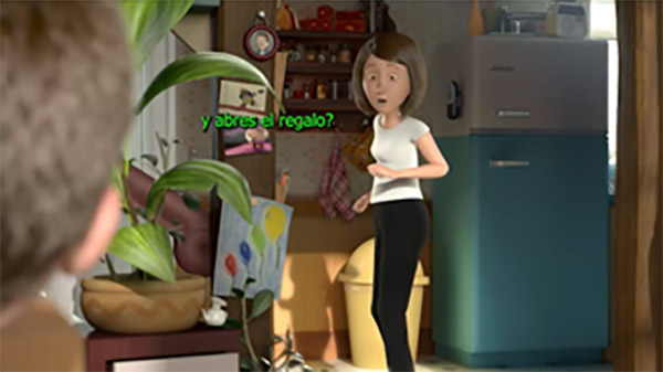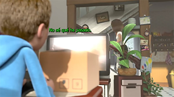 A diferencia de lo que se estipula en la norma UNE 153010, en la subtitulación creativa que hemos propuesto para el cortometraje de The Present, el subtítulo o el texto que aparece en pantalla se ha colocado cerca de la boca de cada personaje, y no centrado en la parte inferior. De esta manera, el espectador podrá identificarlo con más rapidez y, además, no perderá parte de la trama ni detalles de la imagen, como puede suceder cuando se dirige la vista a la parte inferior para leer el subtítulo convencional. Aun así, debemos tener en cuenta que la posición puede variar en aquellos casos en los que no contamine la imagen ni obstaculice ningún elemento que sea importante para la trama.
