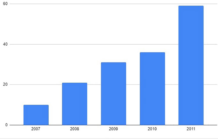 Gráfico 2 - Número de inscrições de curtas paraibanos no ComuniCurtas entre 2007 e 2011.