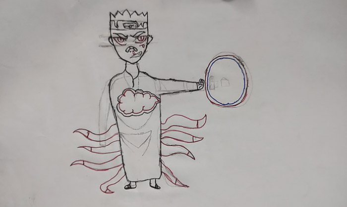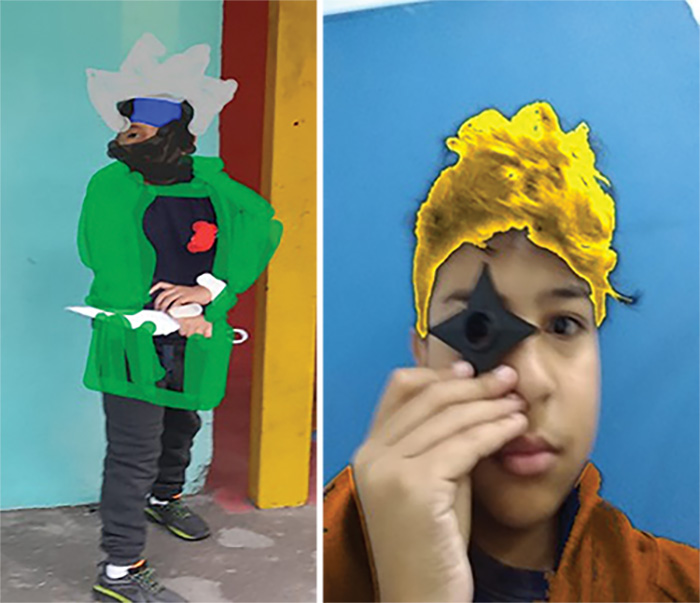 Fotografar-se encenando, compor seus próprios corpos em pinturas, trazer figurinos e brincar com essa possibilidade de transformar o corpo como objeto de Arte, bem como desenhar, criar fanfics e, fazer diferentes pinturas, são algumas das atividades desenvolvidas para convocar informações sensoriais das quais algumas aqui aparecem. O ar, foi o elemento basilar da criação das propostas docente e dos discentes com Naruto em sala de aula, contudo, isso não foi tomado como restrição para que os demais também compusessem as criações artísticas, fossem convocados simbólica ou materialmente.