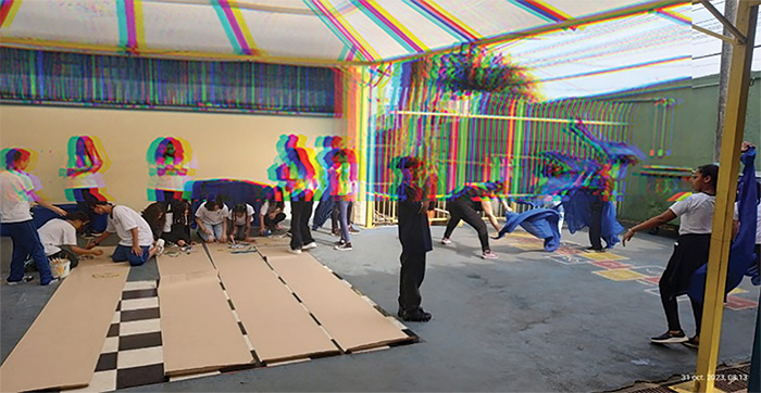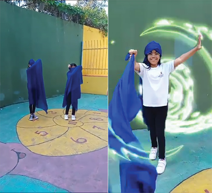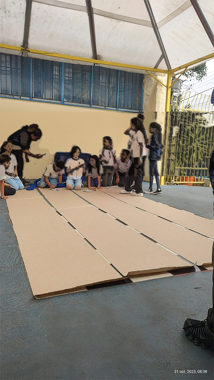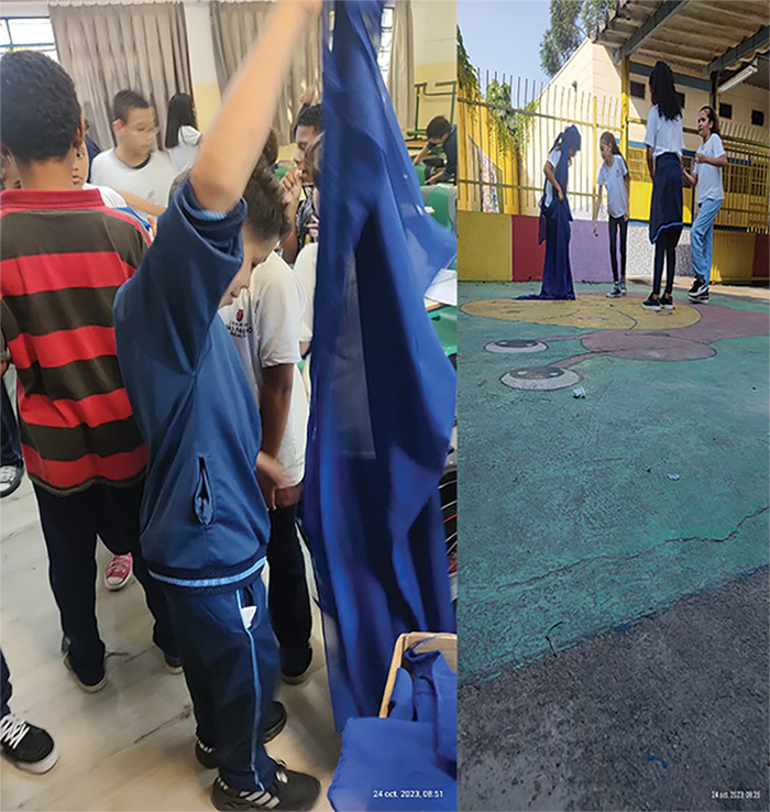 Dando sequência, o pesquisador, sem tempo para fazer o controle de presença (chamada) e avaliar em forma de notas as produções das crianças, deixou os estudantes partirem para mais uma criação performática na escola, e dessa vez, com base nos parangolés de Hélio Oiticica. Anteriormente, dava-se um espaço para um banho de leitura sobre as imagens e os sons das projeções, agora, propõe-se a ação do corpo pelo espaço escolar.
