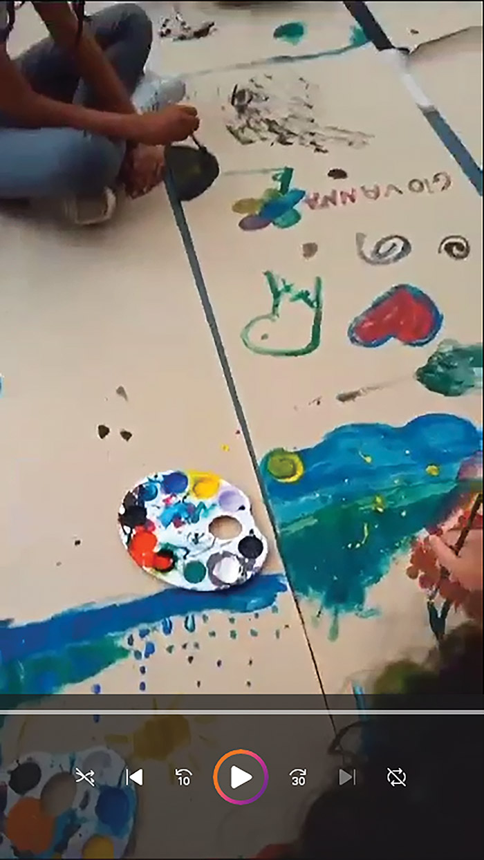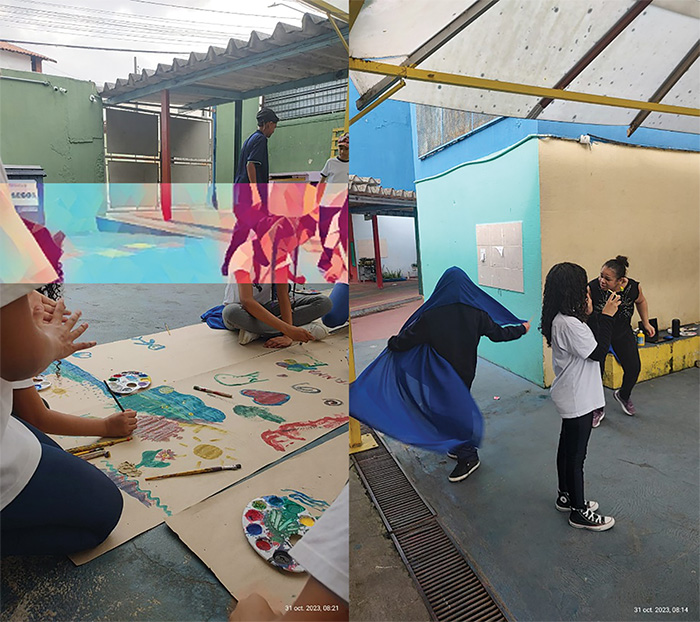 O combinado foi o seguinte: os estudantes formariam grupos e se dividiriam entre eles para que, enquanto alguns fizessem a performance com os tecidos, a pintura sobre o papel ou algo com a argila, os demais filmassem. Com algum tempo de interação, dava-se uma comanda para que trocassem os papéis, tornando as criações mais dinâmicas. Alguns, por estarem tão imersos no que faziam, permaneceram fazendo aquilo que lhes interessava naquele momento e, difícil era tirá-los de lá.