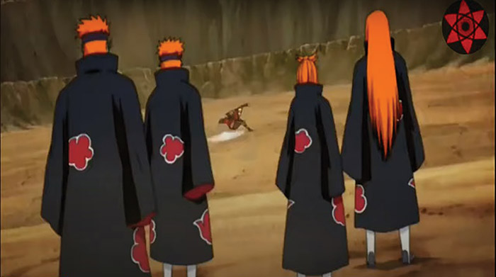Após uma longa pesquisa entre muitos episódios, foi escolhida uma compilação encontrada no Youtube (163- 169, Naruto Shippuden) que mostra a luta de Naruto contra Pain (Seu nome verdadeiro é Nagato). Após derrotar todos os cadáveres que ele manipulava através de seus chacras, ele tem um diálogo final com Naruto, sendo convencido de que a morte e a destruição do povo não seria o melhor caminho, e que sua dor (pois perdera familiares), por mais que ainda existisse, não deveria ser a propulsora de atos horrendos.