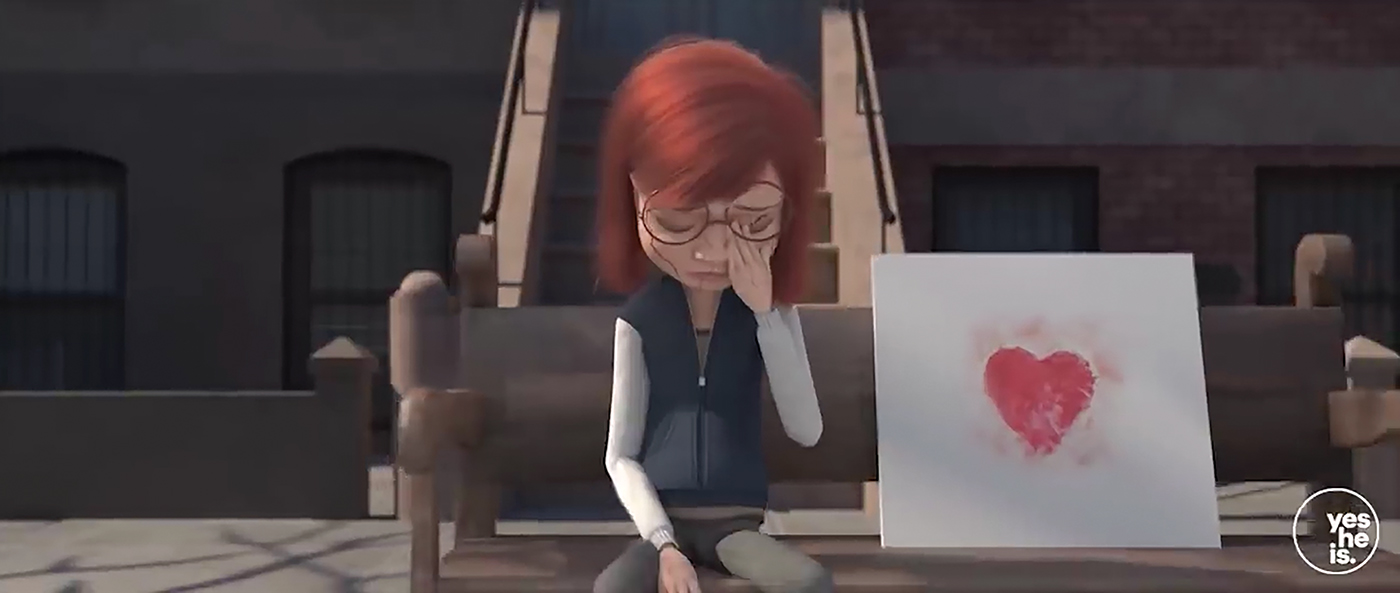 No exterior da escola o sujeito desconhecido observa alegremente (expressão facial) e revela-se Jesus Cristo, que segura a obra de arte da personagem – o coração (tacésica). A curta-metragem encerra com uma mensagem escrita.