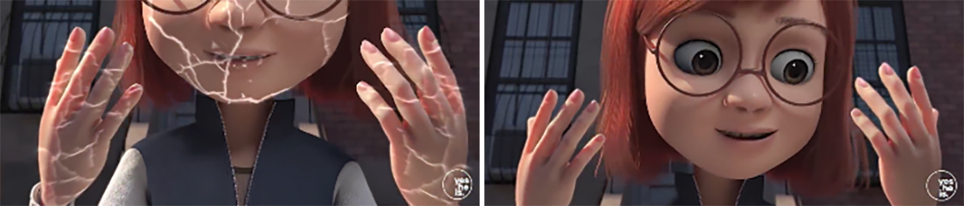 No clímax do filme, a aparência física da protagonista sofre uma transformação significativa. Após receber o presente que simboliza cura e esperança, as fissuras no seu rosto desaparecem, restaurando a sua aparência inicial. Esta mudança visual é acompanhada por uma mudança emocional, com a protagonista demonstrando alegria, confiança e empatia. Além disso, a sua interação com as outras personagens – marcada por abraços e gestos de proximidade – resulta na cura das fissuras nos rostos destas, simbolizando o poder transformador do amor e da empatia.